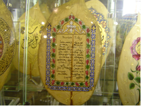 Nihayet raflardaki yaprakları tek tek inceliyorum. Henüz Osmanlıca dersi aldığımdan belli belirsiz "Hoş gör" yazısını okuyorum birinde, içimde çocuksu kırmızı kurdele sevinci...Resmin yasak olduğu Osmanlı’da ruhsal zenginliğin kaligrafiyle yazıya akıtılmasının tören geçidini seyreder gibi sırayla gidiyorum. Onnik Usta bir sürprizi varmışçasına sağımdaki bir rafı işaret ediyor. Yaklaşınca Aramice bereket duası olduğunu fark ediyorum. Mardin’deki Süryani ustaların emeği tarihi bir çeşmenin motifleri tezhiple işlenip içine de bu dua yazılmış. Bir başkasında gubari (3) olarak adlandırılan, desenler içindeki milimetrik yazılara hayranlıkla bakıyorum. Öte tarafta diğer dillerde dinsel ve din dışı kadim sözlerle, figürlerle uygulanmış eserleri gösteriyor. Bazen, "Bu da geçer ya-hû " gibi bir söz veya "gel keyfim gel" gibi bir mutluluk nidâsı. "Ah minel aşk!" ( Ah aşkın elinden!) mesajı da en tutulan motiflerdenmiş. Sûfî (4) semboller olan arslan, kuş, balık gibi yazı ve figürün içiçe geçtiği desenleri de görsel olarak gönülçeliyor.