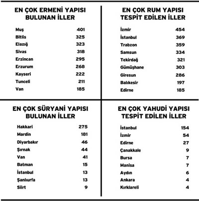 Sayısız kaynak tarandı, arşivlere girildi ve aylar süren çalışma sonucu ‘Türkiye Kültür Varlıkları’ haritası şekillendi. Hrant Dink Vakfı’nın projesi sayesinde, internetteki interaktif bir haritayla Anadolu’daki Ermeni, Rum, Süryani ve Yahudi ibadethanelerini, okullarını, hastane ve mezarlıklarını hem Türkiye çapında hem de şehir şehir, köy köy listelemek ve incelemek mümkün.