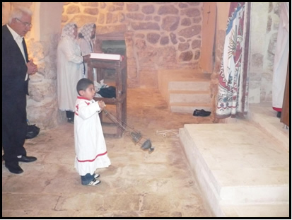 Gördüğüm manzara o kadar derinden etkiledi ki beni o an içinde bulunduğum boyutun derinliğini anlatmam mümkün değil. Söz bitti benim için. Kelimeler o an hissettiklerimi anlatmam için inanın kifayetsiz kalıyor. Dört yaşında bir erkek çocuğu. İsmi Aday. Bakısyanlı Abuna Gabriel Akyüz’ün torunu, şemmas Yuhanna Akyüz’ün oğlu Aday Akyüz. Henüz daha okula bile gitmiyor. Okuma yazması yok. Boyu deseniz bir metreyi geçmez. Ama kendisi medbahın önünde, abunanın karşısında asaletle durmuş; yaptığı işin sanmayın bilincinde değil. Bilakis büyük bir aşkla, tüm benliğiyle, tüm inancıyla ve tüm gücüyle Mesih’e hizmet etmek için kudretli bir asker edasıyla görevi icra etmekte. Elinde şımlo2. Şımlo'nun boyu kendisinden uzun. Ama zaten onun yaptığı işle boyunun bir alakası yok. Olsaydı zaten bunu yapacak cesareti de gösteremezdi. Aday’a bunu yaptıran ne yaşı, ne boyu ne annesinin ne de babasının zoru. Aday’a bunu yaptıran yüreği, imanı, kültürü, içinde yanan Mesih aşkı.